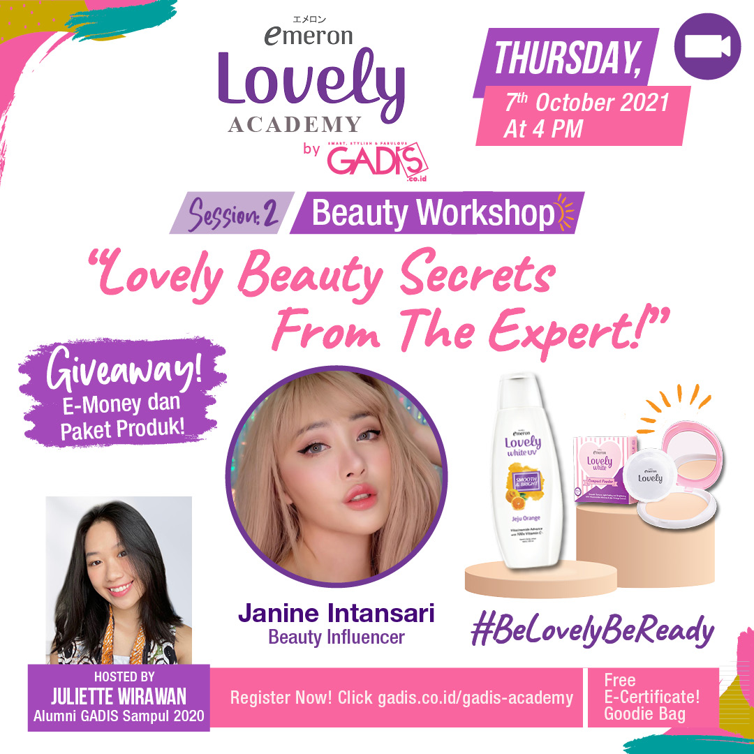 Di virtual class kedua Lovely Academy by GADIS ini mengangkat topik yang super penting untuk kecantikan dan kesehatan kulit kita. Yaitu, Beauty Workshop: “Lovely Beauty Secrets From The Expert!”. GADIS dan Emeron Lovely White menghadirkan bintang tamu seorang beauty influencer yang memiliki segudang karya serta pengalaman di dunia beauty. Yes, ia adalah Janine Intansari. Pasti kamu sudah nggak asing lagi, kan, melihat konten-konten beauty Janine yang keren dan super lovely di berbagai sosial media?
