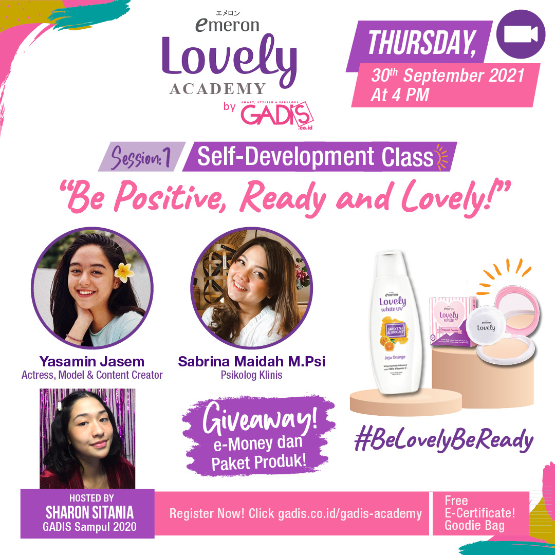 Kelas virtual sesi pertama dalam Lovely Academy by GADIS mengangkat topik Self Development Class: “Be Positive, Ready and Lovely!”. Kelas ini bertujuan untuk memberikan pengetahuan dan wawasan seluruh remaja perempuan tentang cara meningkatkan percaya diri serta self love sehingga peserta mampu membentuk pribadi positif yang selalu ready dan lovely.