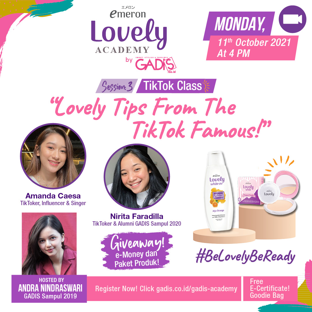 Kelas virtual sesi ketiga dalam Lovely Academy by GADIS ini akan menambah wawasan kita semua dalam berkreasi serta berekspresi menggunakan media sosial yang saat ini tengah populer dan banyak digunakan oleh mayoritas Gen Z, yaitu TikTok. Yes, nggak cuma bisa menjadi media hiburan, TikTok juga bisa memacu kreativitas kita dalam membuat konten video pendek yang menginspirasi.